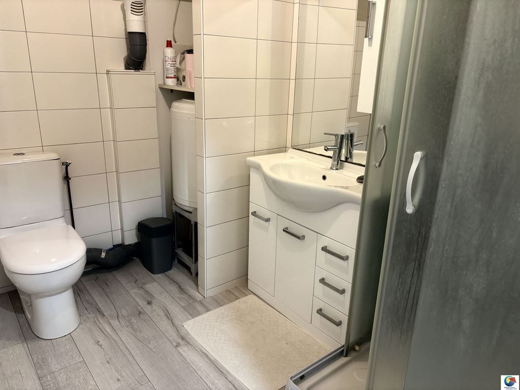 - salle de bain équipée avec douche, meuble simple vasque et WC
